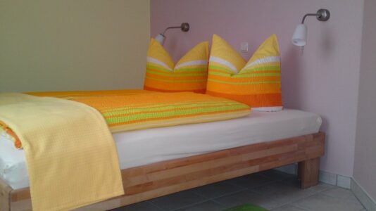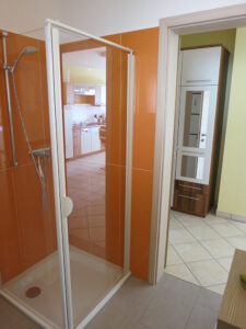 This two bedroom apartment is about 42 m². We have furnished it beautifully so you can relax and have a perfect time during your vacation – these very precious days. And of course there is a modern kitchen with a dishwasher and a fireplace for the cooler days. In the living room, the sofa can also be used for sleeping. From here you can look directly at the sea. The large patio door provides plenty of light and direct access to the garden. The bedroom has a double bed and a cot can be placed.