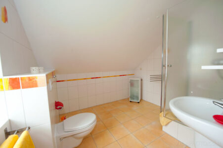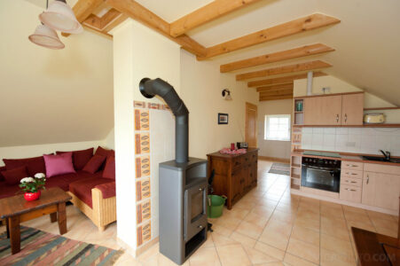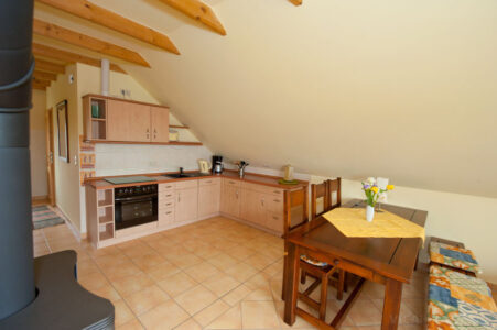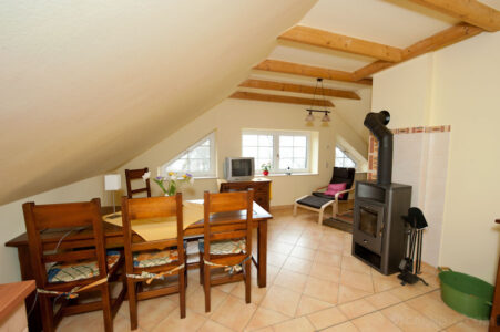 Die ca. 60 m² große 2-Raum-Wohnung befindet sich im Obergeschoss. Sie verfügt im Schlafzimmer über ein Doppelbett und ein Einzelbett. Darüber hinaus bietet die Sitzecke zwei Aufbettungsmöglichkeiten. Die Wohnung ist zusätzlich mit Kaminofen, Geschirrspüler und Fußbodenheizung ausgestattet.