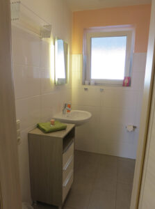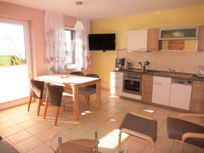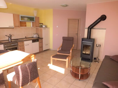 Diese Zweiraumwohnung ist ca. 42 m² groß. Wir haben sie so eingerichtet, dass Sie sich während Ihres Urlaubs – dieser kostbaren und immer zu wenigen Tage – wohlfühlen und optimal erholen können. Dazu gehört natürlich eine modern ausgestattete Küche mit Geschirrspüler ebenso ein Kaminofen für die kühleren Tage. Im Wohnzimmer kann die Couch auch zum Schlafen genutzt werden. Von hier aus schauen Sie direkt auf das Meer. Die große Terrassentür sorgt für viel Licht und den direkten Gartenzugang. Im Schlafzimmer steht ein Doppelbett und es kann ein Kinderbett aufgestellt werden.