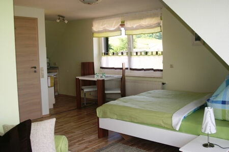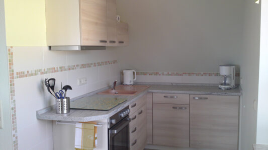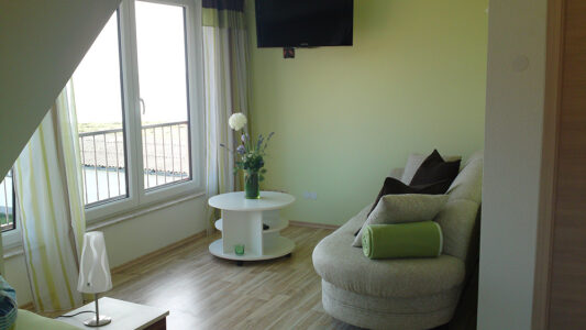 Die ca. 30 m² große und lichtdurchflutete 1-Raum-Wohnung befindet sich im Obergeschoss. Sie verfügt über ein Doppelbett und Flachbild-TV, die moderne Küche ist vollausgestattet und hat einen Elektroherd. Für die bequeme Fernsicht gibt es eine Ottomane.